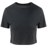 Cropped style T. Short sleeves. Girlie fit. Ribbed crew neck style with taped back neck. Twin-needle stitching detail on sleeve and bottom hem. WRAP certified. SEDEX certified. Vegan certified.