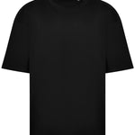 Oversized fit with side seams. Short sleeves. Ribbed crew neck style, with taped neck. Set-in sleeve. Size label only, for easy rebranding – colour-coded black for unisex. Combed ringspun cotton for ultra comfort. Surface excellent for print or embroidery. Twin-needle stitching detail on sleeves and bottom hem. Vegan certified.