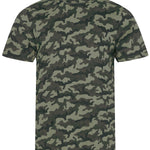 Modern fit short sleeved T. Size tab label. All over camo print. Taped neck. Twin-needle stitching on sleeves and bottom hem. Ribbed crew neck style. Side seams. Set-in sleeves. Worldwide Responsible Accredited Production (WRAP) certified production. WRAP certified. Vegan certified. SEDEX certified.