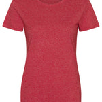 Girlie fit short sleeved T. Size tab label. Marl effect fabric. Stylish fit. Taped neck. Twin-needle stitching on sleeves and bottom hem. Ribbed crew neck style. Soft-feel fabric. Side seams. Set-in sleeves. Worldwide Responsible Accredited Production (WRAP) certified production.