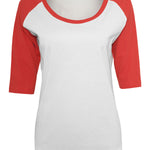 The Women's ¾ contrast raglan tee has a classic sporty look, but with a wider neckline. The three-quarter length raglan sleeves and ribbed cuffs at the neck set subtle contrasts. The single jersey is ideal for embellishing through printing.