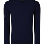 Ribbed shoulder v-neck Merino sweater. Contrast or tonal embroidered Callaway Tour logo on the wearer's right sleeve.