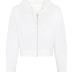 Women's relaxed fit. Cropped cut with drop shoulder design. Full front metal YKK zip. Twin-needle stitching detail. Ribbed cuffs and hem. Brushed inner fleece. Double-fabric hood. Flat lace drawcords. Soft-cotton faced fabric creates ideal printing surface. Simple tear-out label makes it perfect for rebranding. Sedex certified. Vegan certified. WRAP certified.