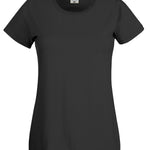 Rib crew neck with self-fabric back neck tape. Shaped side seams for a feminine fit. Fine knit gauge for enhanced printability. WRAP certified.