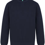 Sustainable fabric using recycled materials. Regenerated cotton mixed with recycled polyester. Brush back fleece. Set-in sleeves. Ribbed cuffs and hemline. V insert at neckline. Back neck tape. Regular fit. Henbury cut-out label for easy rebranding. Biodegradable plastic bag packaging. BSCI certified. Oeko-Tex certified. SEDEX certified.