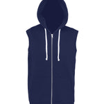 Sleeveless zipped hoodie with metal YKK zipper. Twin needle stitching detailing. Double fabric hood. Contrast flat white drawcords. Hanging loop at back neck. Kangaroo pouch pocket. Ribbed binding detail around armhole. Ribbed hem. Soft cotton faced fabric creates ideal printing surface. Simple tear out label makes it prefect for rebranding. Worldwide Responsible Accredited Production (WRAP) certified production. WRAP certified. SEDEX certified. Vegan certified.