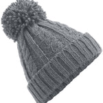 Tear-out label for ease of rebranding. Heavyweight melange cable knit. Self-coloured pom pom. Hand-knitted feel. Suprafleece® thermal band. Cuffed design for optimal decoration. Available in junior and infant sizes. BSCI certified. Reach certified.