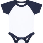 Retro styling baseball bodysuit with contrast sleeves and binding on neck and leg opening. YKK popper fastening at bottom for ease of access and size tab only for easy relabelling.