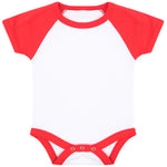 Retro styling baseball bodysuit with contrast sleeves and binding on neck and leg opening. YKK popper fastening at bottom for ease of access and size tab only for easy relabelling.