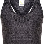 Active crop top and racerback. Self-fabric mesh inserts on front straps, V insert on front and on racerback panel. Self-fabric binding around neck, armholes and back. Tombo tear-out label. BSCI certified. WRAP certified.