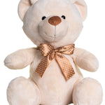Velvet Bears with contrast nose. Brown ribbon with cream spots. Suitable for clothing in size Small, Medium and Large. Complies with EN71 European Toy Safety regulations. Remove all hang tags and their fasteners before giving these items to a child. Not suitable for children under the age of 36 months. BSCI certified. SEDEX certified.