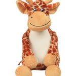 Soft plush zippie giraffe. Contrast hooves, nose and horns. Sewn eyes and mouth. Contrast mane and tail. White panel on tummy perfect for decoration. Zip access on base for direct access onto the tummy for decoration. Removable inner stuffing. Can be embroidered, printed and sublimation printed. Complies with EN71 European Toy Safety regulations. Remove all hang tags and their fasteners before giving these items to a child. Suitable for all ages. BSCI certified. SEDEX certified.