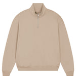 Unisex boxy dry hand feel quarter zip sweatshirt. Set-in sleeve. Neck collar in self-fabric. Herringbone tape at inside back neck and at inside of zip. Quarter zip at centre front. 2x1 rib at sleeve hem and bottom hem. Armhole, sleeve hem and bottom hem with twin-needle topstitch. GOTS certified. Fairwear certified. Vegan certified.