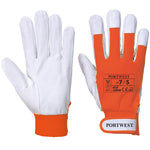 Durable goat grain leather glove with hook and loop, fastening cotton back and reinforced fingertips. Suitable for light industrial applications.