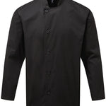 A durable long sleeve chef's jacket that fastens down the right hand side of the body with five long life resin buttons. On the upper left sleeve there is a handy double pocket pen compartment. This jacket is styled with a mandarin collar and is available in Black and White and offers great value for money.
