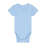 Short sleeve baby bodysuit. Set-in sleeve. 1x1 rib binding at neck collar and leg opening. Snap placket at shoulder. Snap closure at bottom.