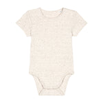 Short sleeve bodysuit with set-in sleeve. 1x1 rib binding at neck collar and leg opening.