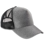 5-panel cap (4 mesh/1 fabric). Sparkle fabric stiffened front panel and peak. Mesh back with ponytail hole. Tear-release adjuster. Semi-curved fabric peak made from recycled plastic. Tear-away label.