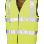 120g/m² 100% Polyester High visibility Class 2 safety vest with 2 bands of reflective tape around torso and one brace over each shoulder. Tear release front fastening for easy access and grey polyester bound edges. Generous in size allowing to be worn as an over garment. EN ISO 20471 + A1:2016 CLASS 2. RIS-3279-TOM ISSUE 2:2019 CLASS 2 (orange). Oeko-Tex certified. Decorating methods: Embroidery, transfer, print.