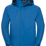 Water resistant garment. PU coated with critically taped seams, fabric is waterproof to 2000mm and breathable: 2000gsm per 24 hours. Active fit: articulated elbows, raglan sleeves and concealed hood. Advanced features include; zipped handwarmer pockets with internal pocket for phone/MP3, storm flap with rain channel, reversed zips and soft touch inner collar. Concealed 3 piece hood, fully lined with discreet concealed decoration access at hem. BSCI certified.
