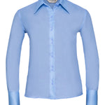 Made using the newest technologies of non-iron fabric that stays wrinkle free and keeps the wearer looking and feeling smart all day long. Contemporary fit combined with contemporary designed features. Stylish and relaxed long edged collar. Fashionable twin button fastening. Shaping at the waist for flattering feminine silhouette. Long, squared edge flared cuff with single button fastening and option for cuff links. Rounded hem. WRAP certified.