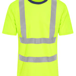 Certified EN ISO 20471:2013+A1:2016. RIS-3279-TOM ISSUE 1:2016 (Orange only). HV Orange/Navy & HV Yellow/Navy - Class 2. Ribbed contrast colour collar. Twin-needle stitching on shoulder. Twin-needle stitching on sleeve and bottom hem. Over shoulder and around body reflective tapes. Around body tape finishes before the side seam for comfort and ease of fit.