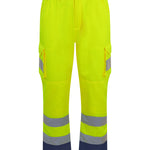 Certified EN ISO 20471:2013+A1:2016. RIS-3279-TOM ISSUE 1:2016 (Orange only). HV Orange/Navy & HV Yellow/Navy - Class 1. Navy - Non Certified. Water-repellent finish. Side elasticated waistband with 7 belt loops. Zip fly fastening. 2 side seam pockets. 2 cargo pockets. 1 rear pocket with tear and release fastening. Internal knee pad pockets. 2 bands reflective tape around leg.