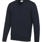V-neckline sweatshirt. Ribbed neckline, cuffs and hemline. Soft cotton faced fabric creates ideal printing surface. Name label at back neck. Taped neck. Twin needle stitching for durability. Worldwide Responsible Accredited Production (WRAP) certified production. Set in sleeves. WRAP certified. Vegan certified. SEDEX certified.