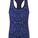 Tear-out label. Fitted body, racerback, scoop neck. Non-transparent. Plain binding and flat-locked seams. Two looks in one - fashion print on one side; plain on reverse. Vegan certified.