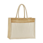 Every piece in the unlaminated Natural Starched Jute collection has angular edges and a sturdy construction for more boxy styling and structured storage. The fabric is tactile to the touch and rustic in aesthetic, yet still robust and reliable. This jute shopper is a multifunctional must-have, finished with a print-friendly front pocket made from 100% organic cotton canvas. Cotton carry handles ensure complete comfort. Also available in a smaller midi size (WM483).