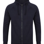 Tear-out label. Unisex slim fit zip-through hoodie. Self-fabric side panels, with stitched eyelet detail. Raglan sleeves. Deep stretch ribbed hem and cuffs. Metal Zipper. 2-piece hood, with single Jersey lining. Functional flat lace drawcord. 2 front pockets. Tonal cover stitch detail. Single Jersey back neck tape. SEDEX certified. Oeko-Tex certified. BSCI certified. Vegan certified.