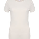 Feel good women's stretch t-shirt with enzyme wash for unique soft hand-feel. 96% cotton, 4% elastane for improved fit, comfort and shape retention. Modern long-line fit. Crew-neck with back neck binding and soft stretchy rib neckline. Features tear out label. SEDEX certified. Oeko-Tex certified. BSCI certified. Vegan certified.