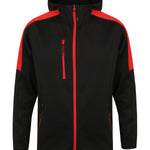 Contemporary softshell jacket with 3 piece hood. Contrast colour panelling on shoulders and upper sleeve. Soft-touch Jersey fabric with bonded microfleece reverse. Zipped chest and side pockets and contrast colour centre front zip with non-slip gripper zip pulls. Side body panels with topstitching. Dropped back hem. Stretch binding at cuffs and hem. Set-in sleeves. BSCI certified.