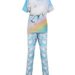 A pyjama set featuring everyone favourite mythical creature, the Unicorn! A two piece set with short sleeve pyjama top printed with a galloping Unicorn. The pyjama bottoms are full length with a comfortable elasticated waist, cuffed ankles and printed with hundreds of galloping unicorns.
