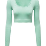 Seamless. Cropped, long sleeve top. Deep crew neck. Double-layered under bust for extra support. Ribbed detailing. BSCI certified. SEDEX certified. WRAP certified. We recommend using block out vinyl and inks.Product contains no branded neck or waist label.* Removable Kimble or looped garment tags. Inner seam label holds important product information on one label with a second label containing brand information which can be cut-away.