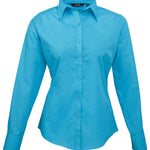 An stylish long sleeved ladies Poplin blouse that comes in 27 colours from Premier's 'Colours Collection.' This blouse offers the wearer a semi-fitted feminine styling with a soft collar, bust, back darts and a rounded bottom hem. A great all-round every day work blouse.