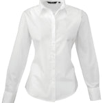 An stylish long sleeved ladies Poplin blouse that comes in 27 colours from Premier's 'Colours Collection.' This blouse offers the wearer a semi-fitted feminine styling with a soft collar, bust, back darts and a rounded bottom hem. A great all-round every day work blouse.