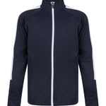 Knitted tracksuit top with contrast colour panels on outer sleeve. Contrast colour centre front zip. Zipped side pockets. Funnel neck and 1x1 ribbed cuffs. Semi-automatic lock zip sliders on all zips. BSCI certified.