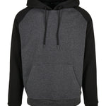 Raglan hoodie for men with contrasting sleeves. Hood, kangaroo pocket and wide cuffs on sleeves and hem provide the necessary comfort. The hooded sweatshirt is perfectly suited to be refined and can be easily customised. This item is manufactured in a FAMA Certified factory. FAMA stands for Facility and Merchandise Authorisation and is a high standard production certificate. .