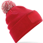 Tear-out label for ease of rebranding. Two-tone pom pom. Double-layer knit. Ribbed cuff. Cotton twill patch for printing. Reach certified.