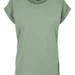 The women's extended shoulder tee from Build Your Brand offers a round-neck line, small rib cuff, extended shoulders and turn-up sleeves. This combination of features creates a sporty and trendy look. The light single Jersey and long cut ensure a comfortable fit. This product is ideal for rebranding, print and embroidery. This item is manufactured in a FAMA Certified factory. FAMA stands for Facility and Merchandise Authorisation and is a high standard production certificate. . Reach certified. FAMA certified.