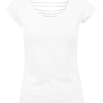 The Women's back cut tee is a feminine shirt with cool v-shaped cut-outs in the back. A large rounded scooped neckline and short sleeves complete the look. The lightweight single Jersey is ideally suited for embellishment and printing.