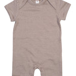Soft and stretchy fabric. Yarn-dyed narrow stripes. Striped envelope neckline. Poppers at crotch for ease of dressing. Shorts-style leg length. Tear-off label. Oeko-Tex certified. Organic 100 Content Standard certified.