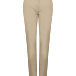 Women's slim fitting chino with added stretch for comfort and ease of movement. Includes YKK front zipper, belt loops, slanted side pockets, two single jet back pockets, back darts for added fit and DTM buttons. BSCI certified.