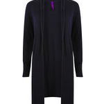 Fine knit, 12 gauge women's long line loose cardigan. Half ribbing detail on body and sleeves. Semi-fashioned sleeve. Henbury cut-out brand label. Co-ordinates with HB720 product range. BSCI certified. Oeko-Tex certified. SEDEX certified.
