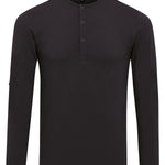 Long sleeve tee that has roll sleeve capabilities with button tab on the inside of the sleeve to secure in place. Round neck style with three a button placket. Twin-needle stitching to the hem and cuff. BSCI certified. Reach certified. SEDEX certified.