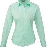 An stylish long sleeved ladies Poplin blouse that comes in 27 colours from Premier's 'Colours Collection.' This blouse offers the wearer a semi-fitted feminine styling with a soft collar, bust, back darts and a rounded bottom hem. A great all-round every day work blouse.