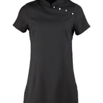 Beauty and spa tunic with mandarin collar. Side yoke detail with four feature buttons and satin trim. Princess seams and bust darts for flattering fit. Side vents. Back zip fastening. Satin piping to collar edge. Short sleeves. Easycare. BSCI certified. Reach certified.