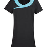 The 'Ivy' beauty and spa tunic offers a flattering V-shape across the shoulders and collar lines. The V-shape is enhanced by a deep coloured trim of and looks great against the main black body of the tunic.