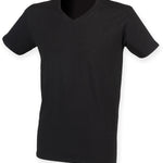 Feel good men's stretch t-shirt with enzyme wash for unique soft hand-feel. 96% cotton, 4% elastane for improved fit, comfort and shape retention. Modern long-line fit. V-neck with back neck binding and soft stretchy rib neckline. Features tearable removable label. SEDEX certified. BSCI certified. Oeko-Tex certified. Vegan certified.